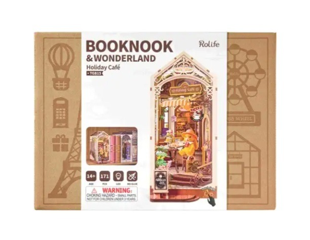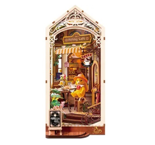 De TGB15 Rolife Holiday Café is een houten bouwset voor volwassenen en iedereen vanaf 14 jaar. Deze overdekte miniatuur binnenplaats is vol details. Een oranje konijn met roze hoedje en rode strik geniet van een croissant en een stukje taart, terwijl een kopje koffie met roomversiering en een goudkleurig bekertje naast hem staan. Bloemenvaasjes, een baldakijn met bloemenslinger en grote boogramen maken het tafereel compleet.
