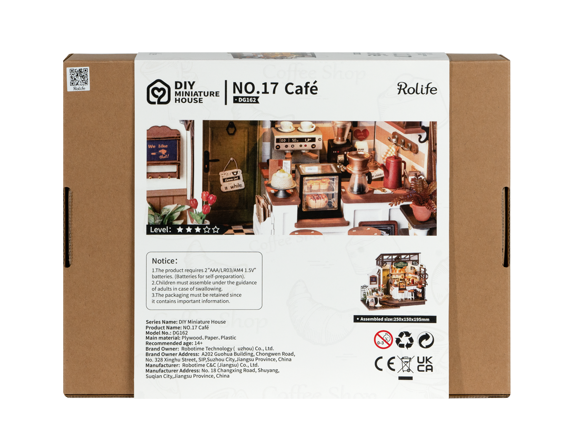 De DG162 Robotime No.17 Slow Life Café Shop is een sfeervol houten bouwpakket, perfect voor volwassenen en gevorderde bouwers vanaf 14 jaar. Dit charmante bruine café heeft een warme uitstraling en is voorzien van barkrukken, een gezellig zitje buiten met een plantje, krantje en croissantje. Binnen staan lekkernijen zoals een taart en vind je een koffiemachine en een koffiekan, waardoor het geheel echt voelt als een café.