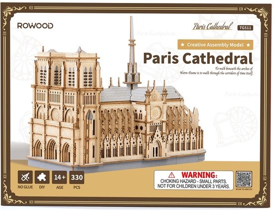 De TG511 Rowood Paris Cathedral 3D Wooden Puzzle is een houten bouwset voor volwassenen. De modelbouwer herbouwt de iconische Notre Dame met dit houten bouwpakket van Rowood. Met 330 gelaserde stukjes hout in twee kleuren bouwt men in circa twee uur een gedetailleerd schaalmodel. De gotische torens, roosvensters en luchtbogen maken dit meesterwerk tot een pronkstuk in huis.