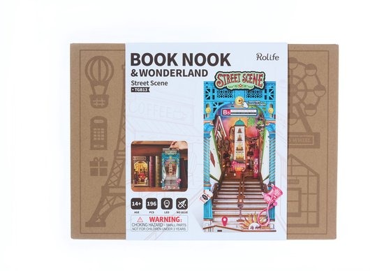 De TGB13 Rolife Street Scene DIY Book Nook Shelf Insert is een intrigerend houten bouwpakket van een book nook voor volwassenen. Het is een betoverend miniatuurstraatje met blauwe gevel, smalle metrotrappen en sfeervolle verlichting die de kern vormt van deze book nook. Details zoals koffiebeker, roze tas en een verborgen treinstationnetje achter de ronde boogopening maken de scene levensecht. De spreuk “no fixed path, pause wherever beauty whispers” geeft het geheel een poëtisch karakter.